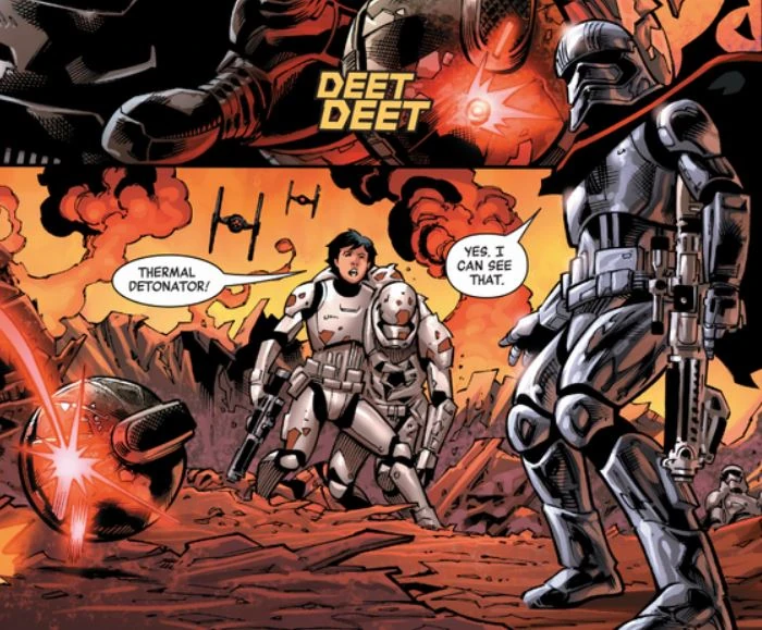 Za Phasminými zády se objeví nepřátelský voják, KM-8713 ho včas zpozoruje a střelí blasterem. Demirian z posledních sil vrhne stormtrooperům pod nohy termální detonátor. Phasma sáhne po DB-7197 a se slovy "Buď užitečný" ho hodí na ležící detonátor. Stormtrooperovo tělo tak ztlumí účinky výbuchu. Phasma poté velí k ústupu a nařídí KM-8713, ať se k ní později dostaví na hlášení.
