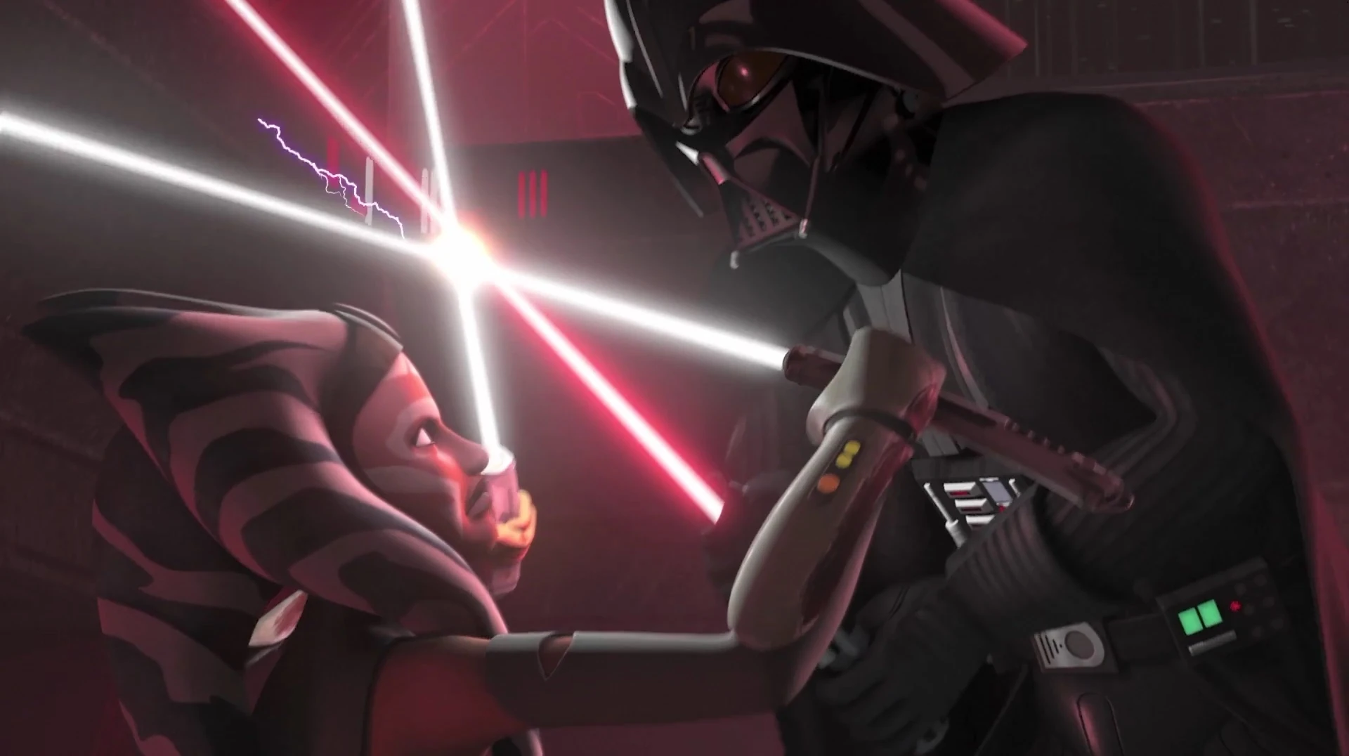Ahsoka bojuje se svým bývalým mistrem, dříve rytíř jedi Anakin Skywalker, nyní sithský lord Darth Vader, v duelu se světelnými meči.