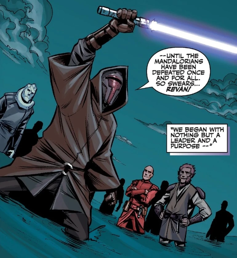 - «Δεν κέρδισαν τα σκάφη σου, οι άνδρες σου, ούτε η περίφημη "μάχη για ελευθερία" αυτήν, την τελική μάχη του πολέμου. Υπερίσχυσες χάρη στις πράξεις ενός ανθρώπου, του Τζεντάι Ρέβαν. Οι στρατηγικές και οι τακτικές του νίκησαν τους καλύτερους από εμάς. Ακόμη και ο ίδιος ο Μάνταλορ αιφνιδιάστηκε από την αγριότητα, την επιμονή και την επιδεξιότητα των σχεδίων του Ρέβαν.»