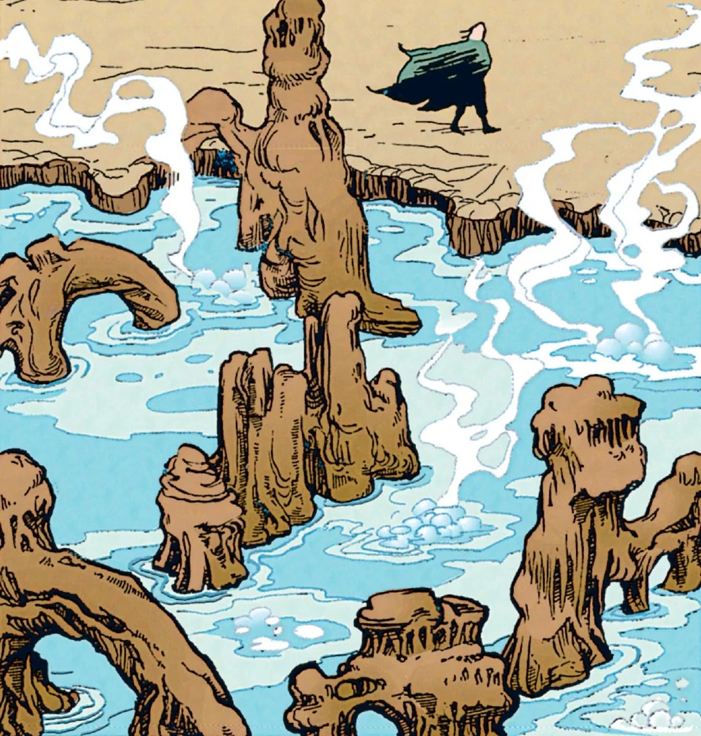 El cañón era extremadamente vasto y medía más de un kilómetro de profundidad, un kilómetro de largo y medio de ancho. Las paredes interiores del cañón estaban bordeadas por pequeñas cuevas, y un río profundo yacía en el pozo del cañón, girando y girando para coincidir con la forma notable del cañón. A lo largo de las paredes de cañón y dentro de las cuevas había una gran cantidad de estalagmitas, algunas de las cuales estaban cubiertas de cristales transparentes. Aunque los cristales no tenían un impacto en la Fuerza, Thon y otros Jedi, los usaron para enfocarse durante la meditación. El cañón tenía varios niveles, cada uno marcado con diferentes estratos, algunos tenían repisas y acantilados, mientras que otros tenían enormes cuevas y túneles. A lo largo de la historia de Ambria, nadie intentó explorar adecuadamente estas formaciones rocosas.[1]