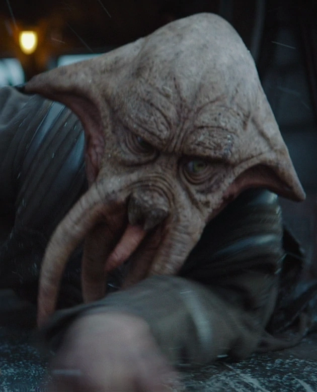 Un arrastrero quarren trabajaba en el planeta helado Pagodon y acosó a un mythrol en una taberna junto a otros dos arrastreros. Los arrastreros planearon cortar las branquias del mythrol y venderlas, pero antes de que pudieran, el cazarrecompensas conocido como el Mandaloriano entró en el bar y los distrajo. El arrastrero líder declaró que el mandaloriano había derramado su bebida, y cuando el cazarrecompensas lo ignoró, el trío de arrastreros rodeó al mandaloriano. Luego, el cazador derrotó rápidamente al trío y mató al perpetrador quarren, que intentó huir.