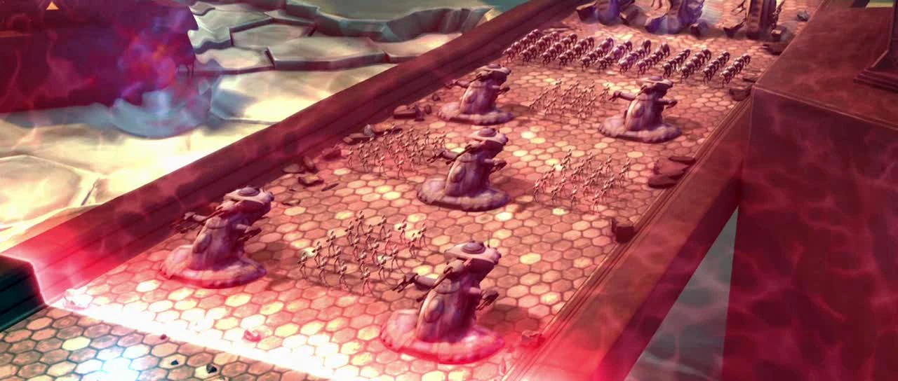 Los droides avanzan detrás del escudo, mientras los cañones de la República tratan de penetrarlo.