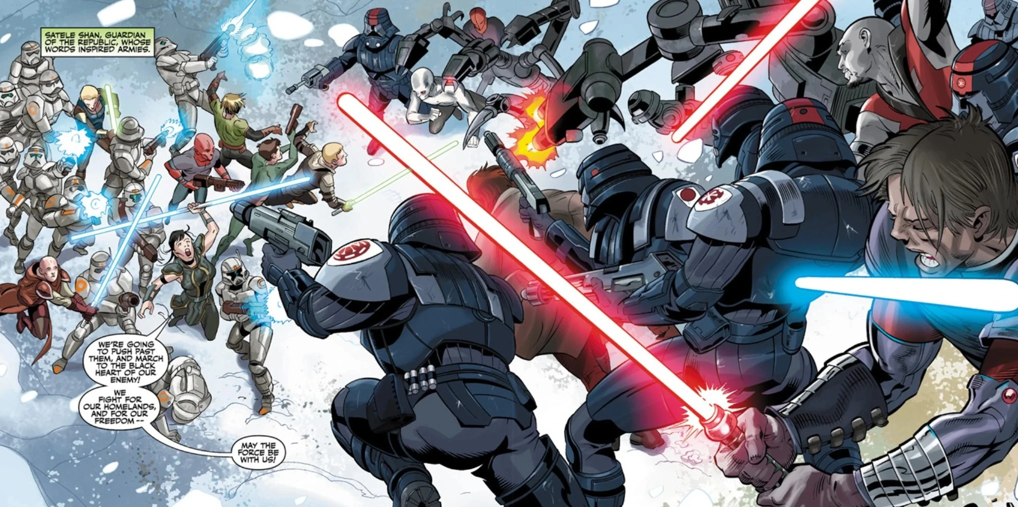 - «No los vamos a detener. ¡Vamos a pasar junto a ellos y marchar hacia el corazón negro de nuestro enemigo! Luchamos por nuestra patria y por nuestra libertad—¡que la Fuerza nos acompañe!»