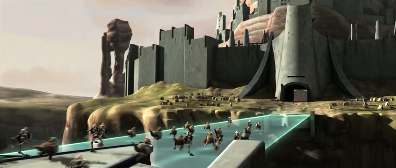 Todavía existía el problema de entrar a la capital, debido a que un puente de plasma era el único acceso, y sus controles se encontraban dentro de la misma ciudad. Las dificultades se incrementaron cuando Tambor ordenó que los civiles fueran sacados de la ciudad y colocados en un campamento al lado de la entrada, empleando el uso de un "escudo viviente"[5] como había hecho el droide táctico TX-20 anteriormente.[7] Debido a que el fuego de largo alcance sería imposible sin arriesgar vidas inocentes, Windu, Syndulla y sus fuerzas fueron forzadas a activar el puente. Al ver a varios vehículos MTT que llevaban la última parte de los tesoros de Tambor hacia él, Windu planeó infiltrarse en el convoy con los soldados Stak y Razor. Tendrían tan solo escazos segundos antes de ser detectados por los droides de batalla, y necesitarían esos segundos para llegar de igual manera al otro lado, debido a que el puente se desactivaría una vez los detectaran. Windu y los soldados reactivarían el puente y le permitirían a las fuerzas de la República entrar en un ataque masivo a la ciudad.[5]