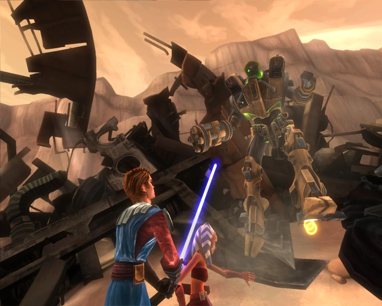 Rex y Boomer fueron delante de los Jedi y Bane para encontrar una posición elevada para proporcionar fuego de cobertura y eliminar a cualquier droide en la zona. Mientras los dos clones se iban del hangar, viajaron al lado de un sendero con vista a los desperdicios de Ryloth. Tras destruir otro tri-droide que recorría los desperdicios, los clones fueron atacados por oleadas de droides de batalla descendiendo de una colina cercana. Cuando dejaron la colina, Rex y Boomer encontraron dos tri-droides que salían de un túnel. Al usar un lanzacohetes, los clones destruyeron los droides masivos y prosiguieron. Mientras tanto, Skywalker y Tano comenzaron su viaje a La Habilidad de la Mano con Bane y el Núcleo consigo. Los dos Jedi protegieron al cazarrecompensas de los droides camaleones B1, B2, y destructores atacantes mientras éste se esforzaba por llevar el Núcleo Gravítico a su nave, de vez en cuando tomando cobertura detrás de cajas para descansar. Al abrirse paso hacia la nave, el camino de los Jedi fue bloqueado por escombros de una nave estelar. Cuando Rex le disparó un cohete, Skywalker, Tano y Bane treparon por los restos. Al encontrarse con un desfiladero sobre un cañóngrande que los separaba de La Habilidad de la Mano, Skywalker y Tano saltaron a través y usaron la Fuerza para levantar el ala más baja de un caza derribado, permitiéndole a Bane seguir su caminando.[1]