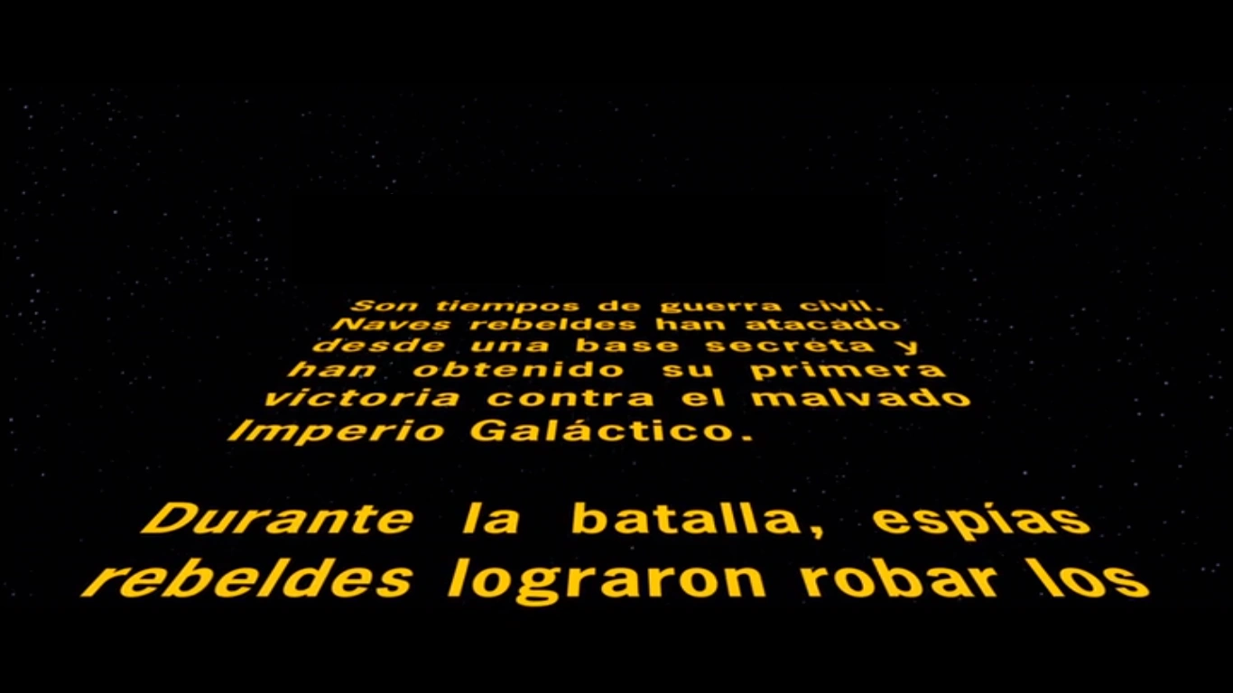 - «Son tiempos de guerra civil. Naves rebeldes han atacado desde una base secreta y han obtenido su primera victoria contra el malvado Imperio Galáctico. Durante la batalla, espías rebeldes lograron robar los planos secretos del arma más extrema del Imperio, la ESTRELLA DE LA MUERTE, una estación espacial blindada con suficiente potencia para destruir un planeta entero.»