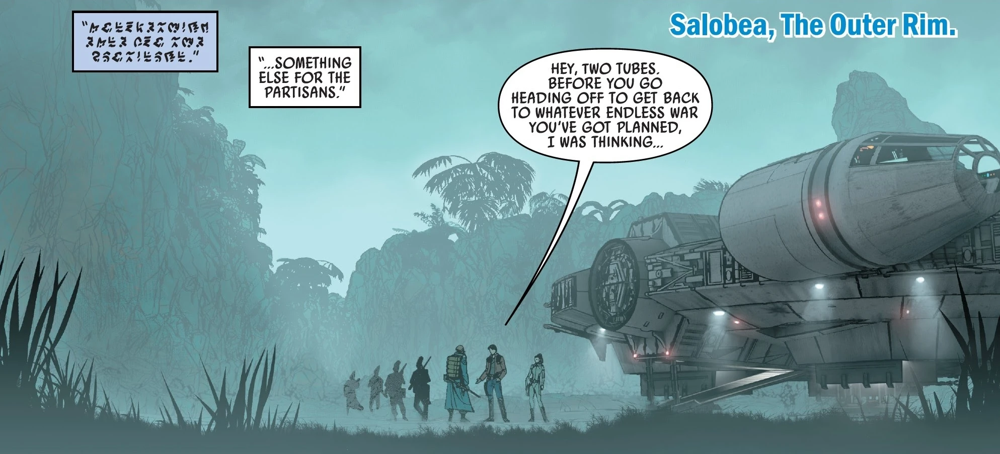Organa se apresuró hasta el lugar y convenció a Benthic para que no destruyera la Espiga, afirmando que ese no era el «sueño» de los Partisanos, un ideal procedente de Saw Gerrera. Benthic aceptó y escaparon de Shu-Torun a bordo del Halcón Milenario. Benthic solicitó que los Partisanos fueran dejados en Salobea, que él describió como «algo distinto para los Partisanos». Una vez allí, Solo recordó el tiempo en que conoció a Benthic cuando era un miembro de los Jinetes de las Nubes, y dijo al líder de los Partisanos que no tenía que ser nada que no quisiera, especialmente sin la motivación correcta. Benthic prestó atención a las palabras e insinuó que cambiaría.[10]
