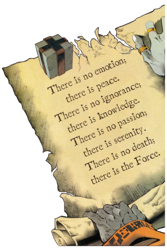 - Las emociones son una parte natural de la vida. Como las grandes sagas nos han mostrado, los Jedis no son inmunes a sentir emociones. El Maestro Jedi Obi-Wan Kenobi y el Maestro Yoda ambos abiertamente expresaron pena cuando descubrieron la muerte de los aprendices a manos de Darth Vader. Esta creencia no dice que las emociones no existen, pero deben ser puestas de lado. Las emociones deben ser entendidas primero, y es el deber de un joven Jedi de explorar sus sentimientos. A menos que un Jedi pueda confrontar sus sentimientos y pensamientos, nunca alcanzara la paz. Las emociones no son negadas, pero si entendidas. A´Sharad Hett recuerda al joven Anakin Skywalker durante sus campañas juntos durante Las Guerras Clon. Hett dice que la ira de Anakin es entendible, pero debe enfrentarla. Esta creencia puede ser modificada para leer "Las emociones no pueden llevarse mi paz".