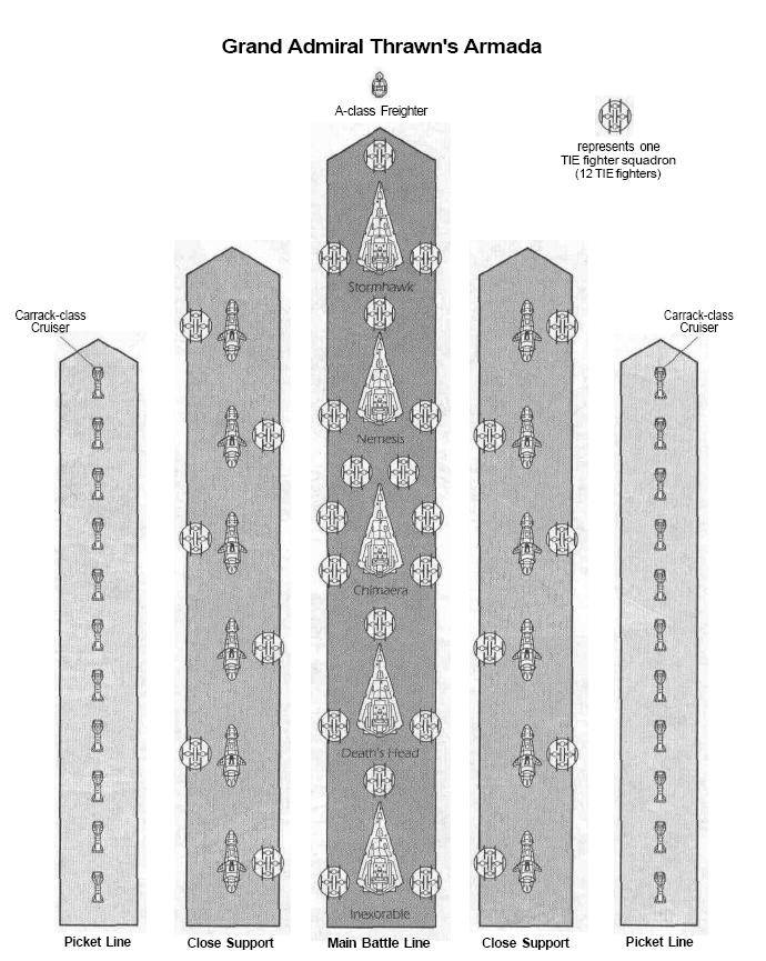 Alzando su bandera en el Destructor Estelar Quimera, Thrawn tomó al popular y respetado capitán Gilad Pellaeon como su segundo al mando. Thrawn se ganó la admiración de los Moffs a través de su supresión de las bases piratas en territorio Imperial, y señores de la guerra como Ardus Kaine y Delak Krennel acordaron una confederación militar temporal. El Consejo Regente de Ars Dangor en Orinda le otorgó el puesto nominal de Comandante Supremo, pero en realidad el Consejo y los Moffs acumularon activos militares tanto por miedo entre ellos como por la Nueva República. La fuerza realmente disponible para Thrawn consistía solo en la docena de Destructores Estelares y sus líneas de apoyo que aún quedaban en el Escuadrón de la Muerte después de la derrota en Endor, de los cuales solo seis: el Quimera, el Judicador, el Cabeza de la Muerte, el Halcón de la Tormenta, el Némesis y la Inexorable, le eran completamente leales. Thrawn dividió el escuadrón en dos flotas: la flota de seis Destructores Estelares Leales liderada por el Quimera bajo su mando personal, y una segunda fuerza de seis naves lideradas por el capitán Dorja a bordo del Implacable. Thrawn también reafirmó el servicio de los noghri al Imperio, usándolos como guardaespaldas y comandos.[10]