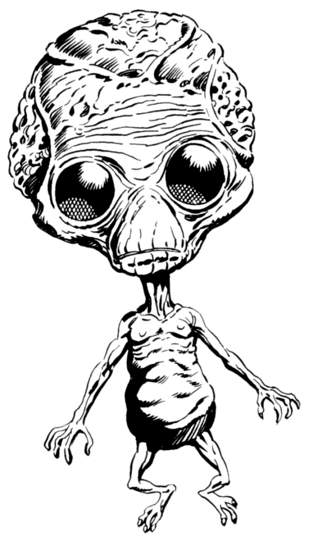 Esta especie bípeda altamente evolucionada era fácilmente reconocible debido a sus grandes cavidades craneales. Por lo general, tenían 1.75 metros de altura, sus cabezas sin pelo y sin nariz ocupaban un tercio de esta altura. Otra característica notable eran sus inmensos ojos negros sin párpados con venas parecidas a gusanos en sus sienes. Sin embargo, su evolución mental tuvo un impacto en sus cuerpos físicos. Como resultado, sus brazos y piernas deshuesados se convirtieron en apéndices que ya no podían soportar su propio peso corporal. Este pasaba incluso en el entorno natural de baja gravedad de su planeta natal. Por lo tanto, sus cuerpos se convirtieron en simples depósitos de sus pulmones, corazones y otros órganos corporales invaluables. Esta tendencia evolutiva también dio como resultado que sus órganos vitales se estiraran hacia su actividad craneal.[1]