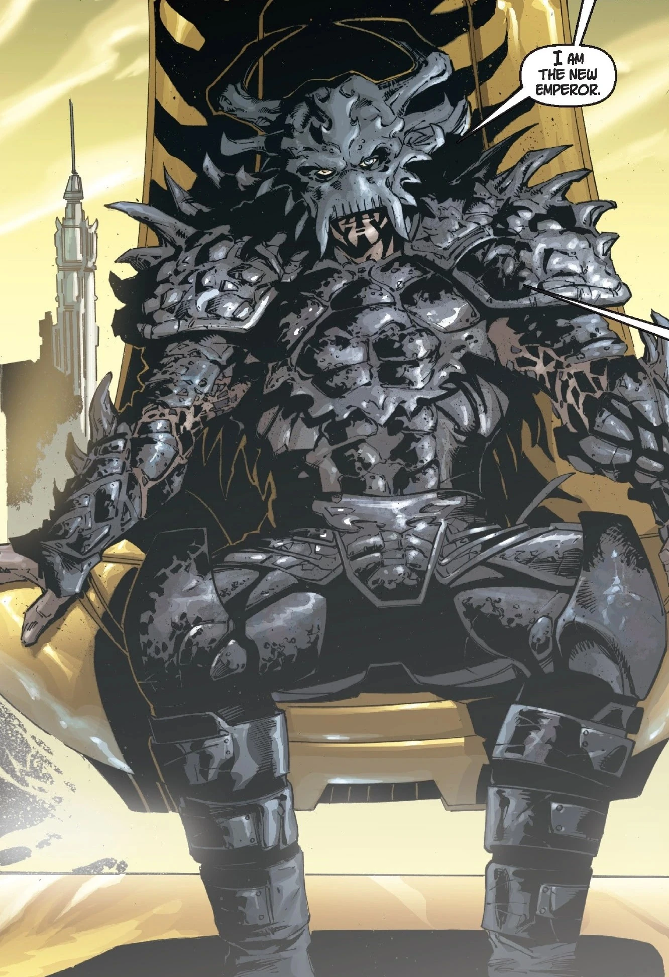 Pero los Jedi habían sido debilitados lo suficiente como para permitir que tomase el siguiente paso; ahora que el Imperio había triunfado, era hora de reclamar su trono. Darth Krayt lanzó una osada revolución en el Palacio Imperial, marchó con su cohorte directo a la sala de audiencia del mismísimo Emperador Roan Fel matando al hombre que estaba sentado en su trono y sentándose en su lugar. Notando la confusión y la indignación de los miembros presentes del Consejo de Moffs les expuso una declaración de los hechos[15]: