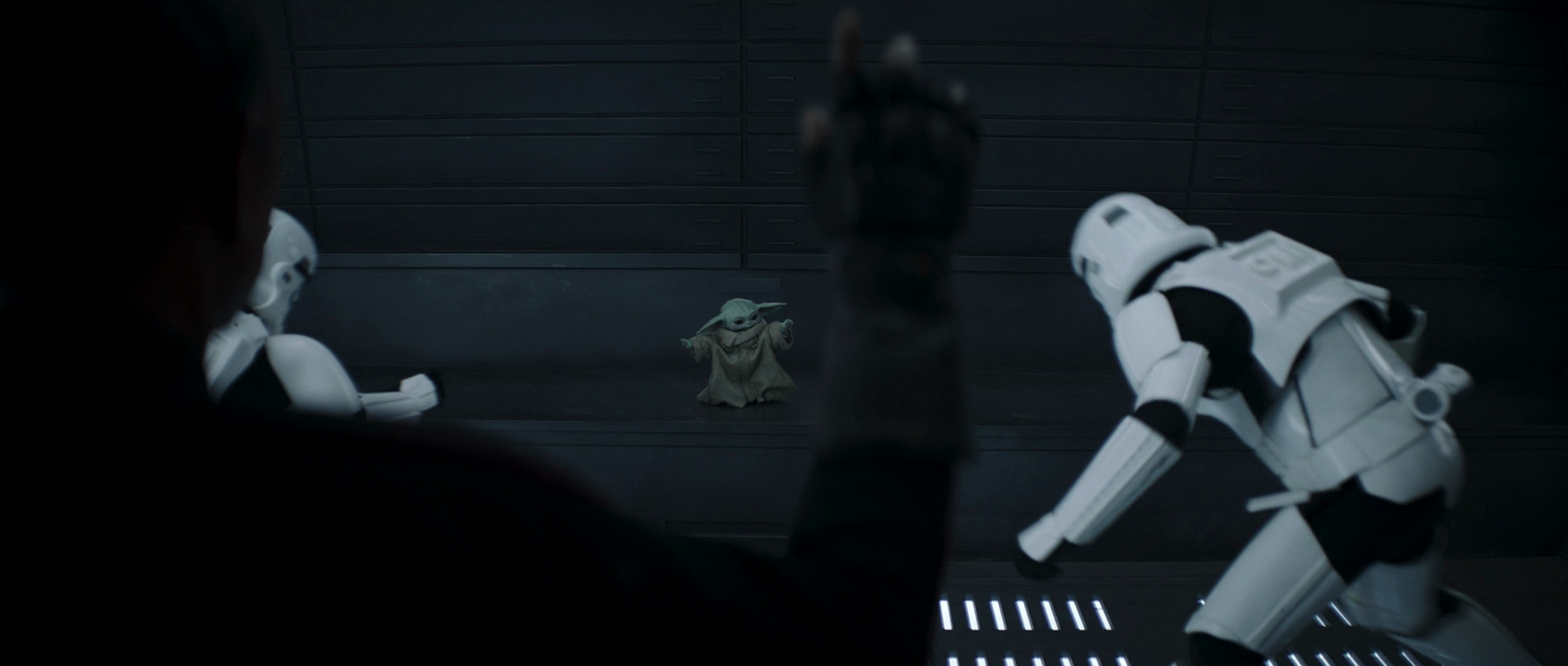 Gideon observa mientras Grogu golpea a dos soldados de asalto