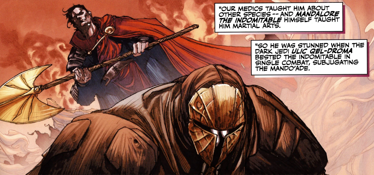 Los Mandalorianos eran una sociedad guerrera cuyas creencias se basaban firmemente en su código de honor. Con la intención de ganar territorio y honor al atacar los siete mundos de Emperatriz Teta, el líder Mandaloriano Mandalore el Indomable, dirigió a sus soldados en varios ataques dentro del espacio Krath. Estos ataques atrajeron la atención personal de Ulic Qel-Droma después de una incursión a una importante estación procesadora de carbonita controlada por los Krath. Pensando que no tenía tiempo para lidiar con mercenarios como los Mandalorianos, Qel-Droma contactó a Mandalore y demandó la rendición inmediata de él y sus ejércitos. Sin embargo, Mandalore rehusó esas demandas, desafiándolo a una pelea mano a mano que decidiría el destino de los siete mundos de Emperatriz Teta. Qel-Droma aceptó la demanda de Mandalore, mas también ofreció sus propios términos si ganaba la pelea: si él derrotaba a Mandalore, los clanes Mandalorianos le jurarían fidelidad, y pelearían bajo sus órdenes. No queriendo que su honor fuera empañado, Mandalore aceptó los términos de Qel-Droma.[2]