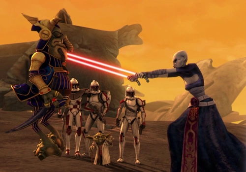 Habiendo tomado una decisión, Katuunko contactó a Dooku y declaró su intención de unirse a la República, citando su negativa a tratar con aquellos que rompieron sus palabras como Ventress había hecho cuando ella envió a los droidekas. Después de decidir que las negociaciones serían más fructíferas con el sucesor de Katuunko, Dooku rencorosamente ordenó a Ventress que asesinara al rey. Los guardias de Katuunko intentaron dispararle en defensa de su monarca, pero ella fácilmente desvió sus disparos antes de que los empujara con la Fuerza y se moviera para matar al rey con sus sables láser emparejados. Sin embargo, los sables rojos fueron detenidos a centímetros de la cabeza de Katuunko por Yoda, y los droides de Ventress fueron rápidamente tratados por los clones. Aunque Ventress no proclamó ningún miedo al Jedi, Yoda la desarmó con la Fuerza antes de aconsejarle que se rindiera. En cambio, Ventress detonó explosivos pre-plantados que destruyeron el yate del rey, escapando cuando Yoda se vio obligado a protegerse a sí mismo y a sus aliados de los escombros que caían. Sin Ventress, Katuunko declaró que las negociaciones eran innecesarias y le presentó a Yoda su espada ceremonial, lo que significaba el comienzo de la membresía de Toydaria en la República justo cuando un crucero de la República llegaba en órbita para extraerlos.[3]