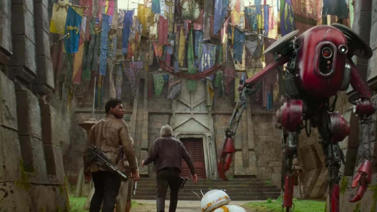 Finn, Rey, Han y BB-8 viajan al castillo de Maz Kanata.