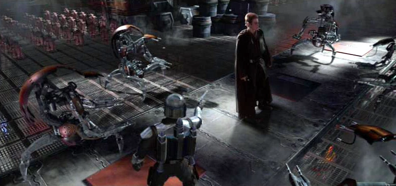 Jango arrestando con varios droidekas a Anakin Skywalker en Geonosis.