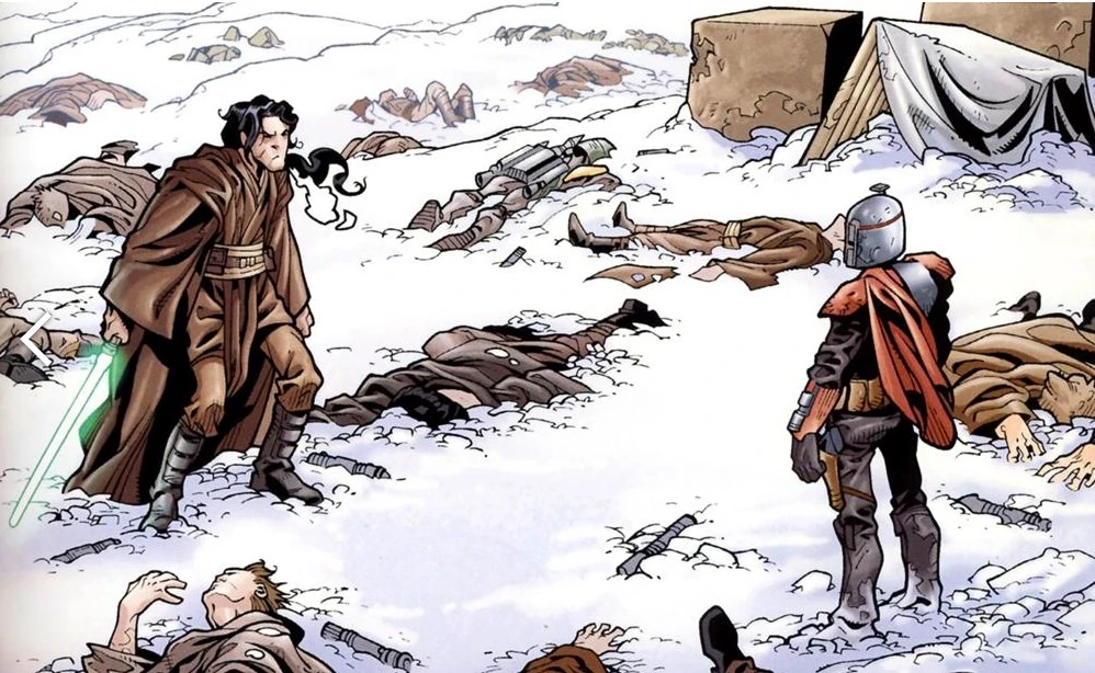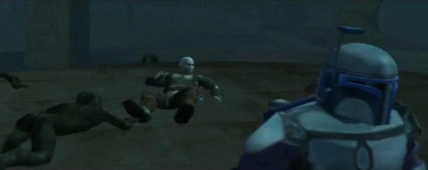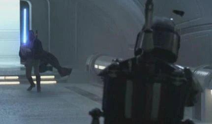 Fett llora su padre adoptivo, mientras que Jaster Mereel se muere.