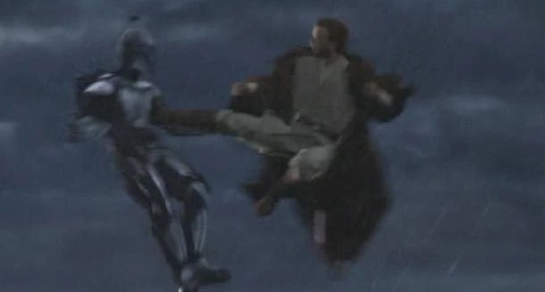 Jango recibiendo una patada de Obi-Wan