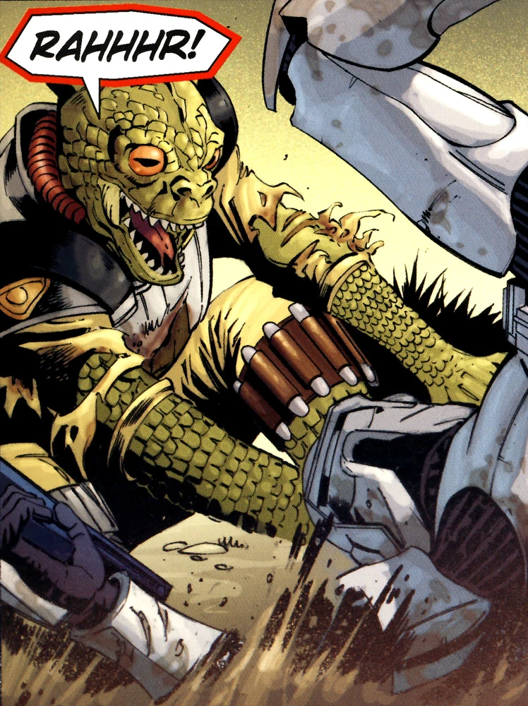 Mientras los dos Jedi hablaban con el Comandante clon Faie, el trandoshano agonizante tomó fuerzas de algún lugar y se abalanzó sobre un soldado clon para terrenos pantanosos, tomando el bláster del soldado muerto y disparando al equipo que lo había vencido. Su intento fracasó, y el Comandante Faie disparó y mató a Karniss.