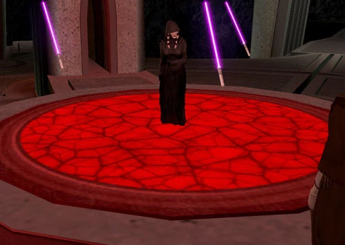 Si la Exiliada es seducida por el lado oscuro, existe la opción de arrojarla hacia el Núcleo Trayus. Esta escena evoca la muerte de Palpatine en El Retorno del Jedi.