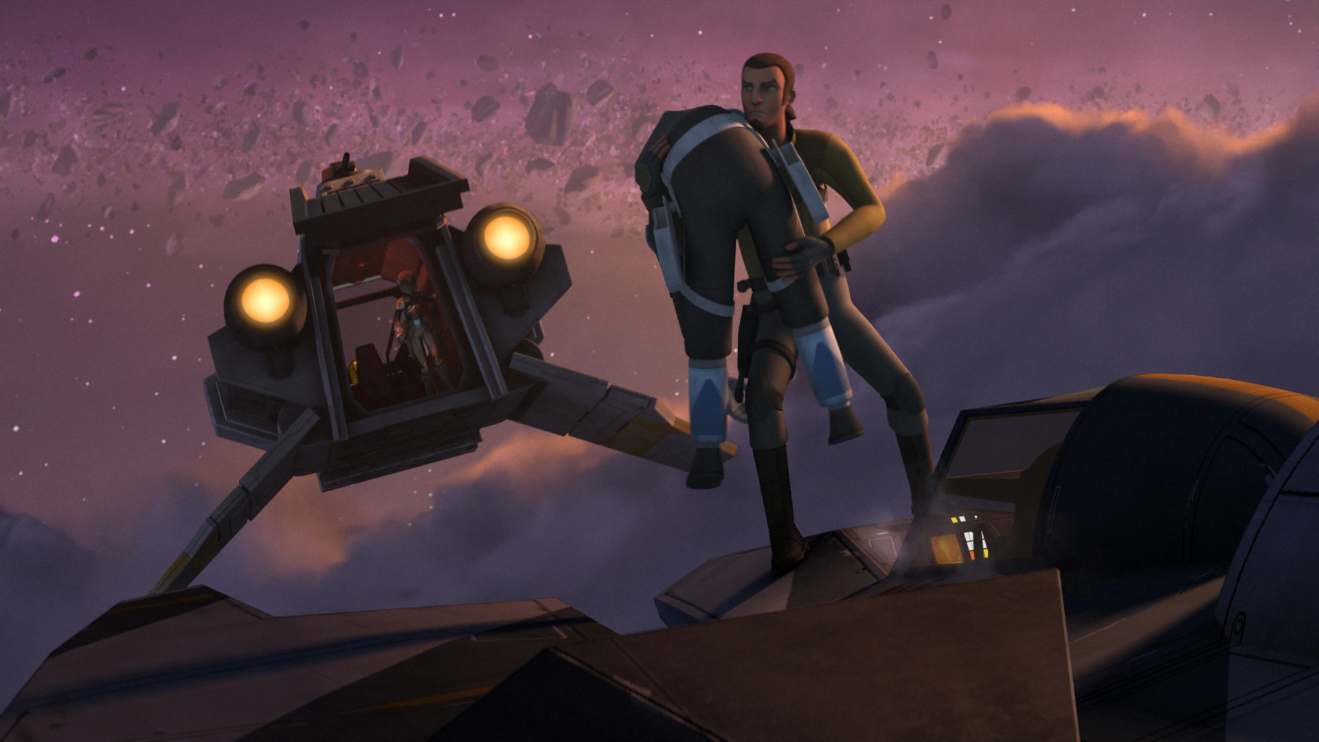 Sin embargo, Kanan logró agarrarse al caza, ya que subió a los cielos. A pesar de los esfuerzos de Fenn de sacudirse el intruso Jedi, Kanan logró utilizar su sable láser para cortar a través de la cabina del piloto y desactivar la consola de control. Mientras tanto, Sabine se encontró con Chopper y los dos volaron hacia el cielo para recoger a Kanan. Después de una pelea a puñetazos, Kanan logró golpear al protector de Concord Dawn hasta dejarlo inconsciente y llevarlo al fantasma.
