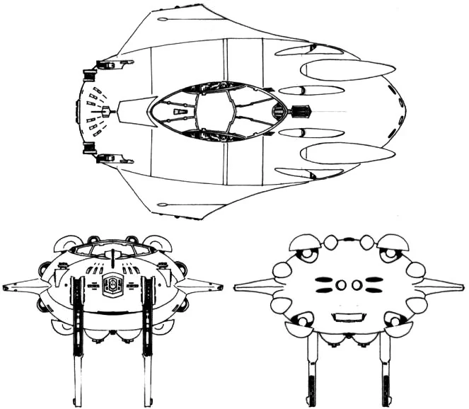 Perfil superior, frontal y trasero de la nave de asalto/rescate clase Dientes de sable.