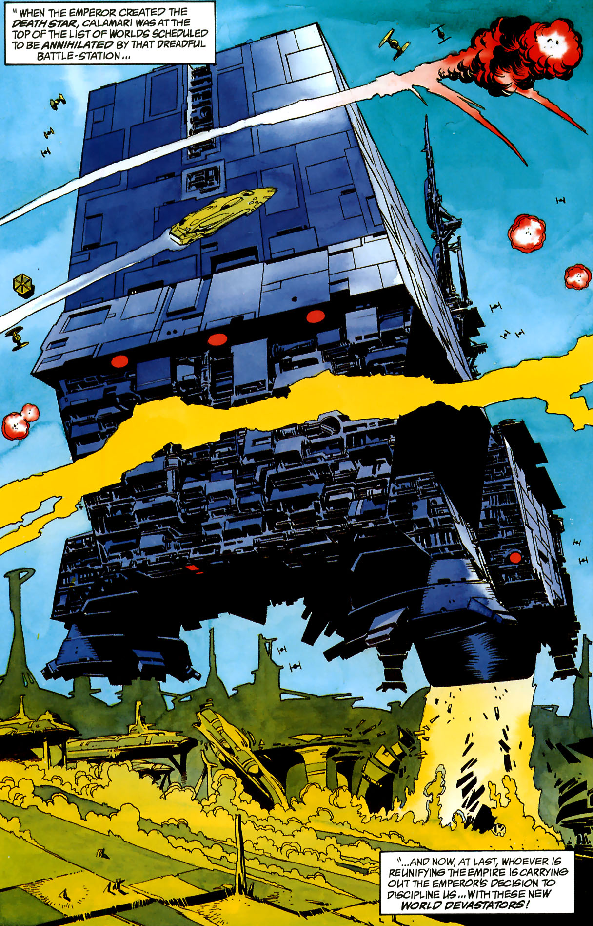 Sin embargo, Luke había contrabandeado con éxito los códigos de mando de los Devastadores de Mundos a Leia, y la Nueva República pudo detenerlos de forma remota. La Batalla de Calamari le costó al Imperio sus nuevas superarmas, pero Palpatine logró que Luke Skywalker se pasara al lado oscuro mientras peleaban en Byss.[2][3]