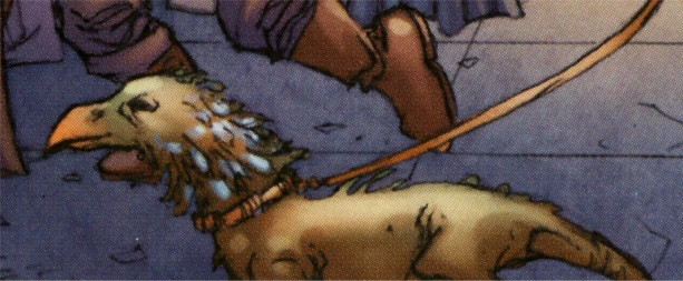 El perro emplumado era una reptiave domesticada y mantenida como mascota en Taris antes y durante las Guerras Mandalorianas. Cualquiera de estas criaturas continuo viviendo en el planeta durante el tiempo de la Guerra Civil Jedi aunque probablemente murieron cuando Darth Malak ordeno que el planeta estuviera sujeto a un bombardeo orbital.