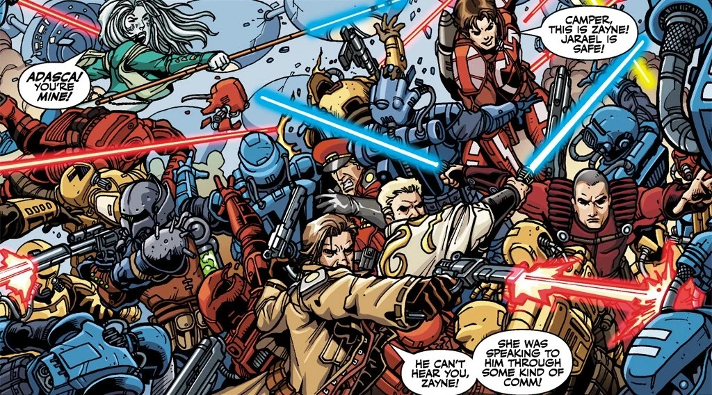 Sin que el resto de los invitados de Adasca lo supieran, Adasca retenía en su calabozo a su viejo amigo, el Maestro Jedi Lucien Draay, y a su fugitivo Padawan Zayne Carrick. Trabajando juntos, los dos Jedi lograron liberarse y formaron una alianza temporal. Con la ayuda del mandaloriano renegado Rohlan Dyre y Carth Onasi, un teniente de la Armada de la República, trabajaron para poner fin al plan de Arkoh Adasca. Mientras Mandalore el Máximo y Saul Karath negociaban por sus respectivas facciones, la reunión relativamente pacífica degeneró repentinamente en un campo de batalla. Zayne y sus cómplices engañaron a los mandalorianos haciéndoles creer que Adasca planeaba asesinar a Mandalore. Creyendo que había sido traicionado, Mandalore el Máximo salió corriendo de la reunión y sus fuerzas abrieron fuego.[1]