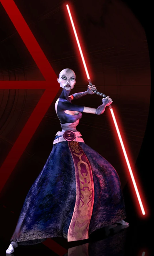 Ventress blandiendo sus sables de luz de empuñadura curva unidos