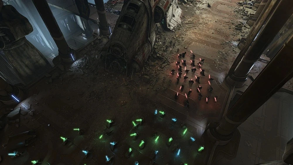 Los Sith y los Jedi se enfrentan en los pasillos del Templo Jedi.