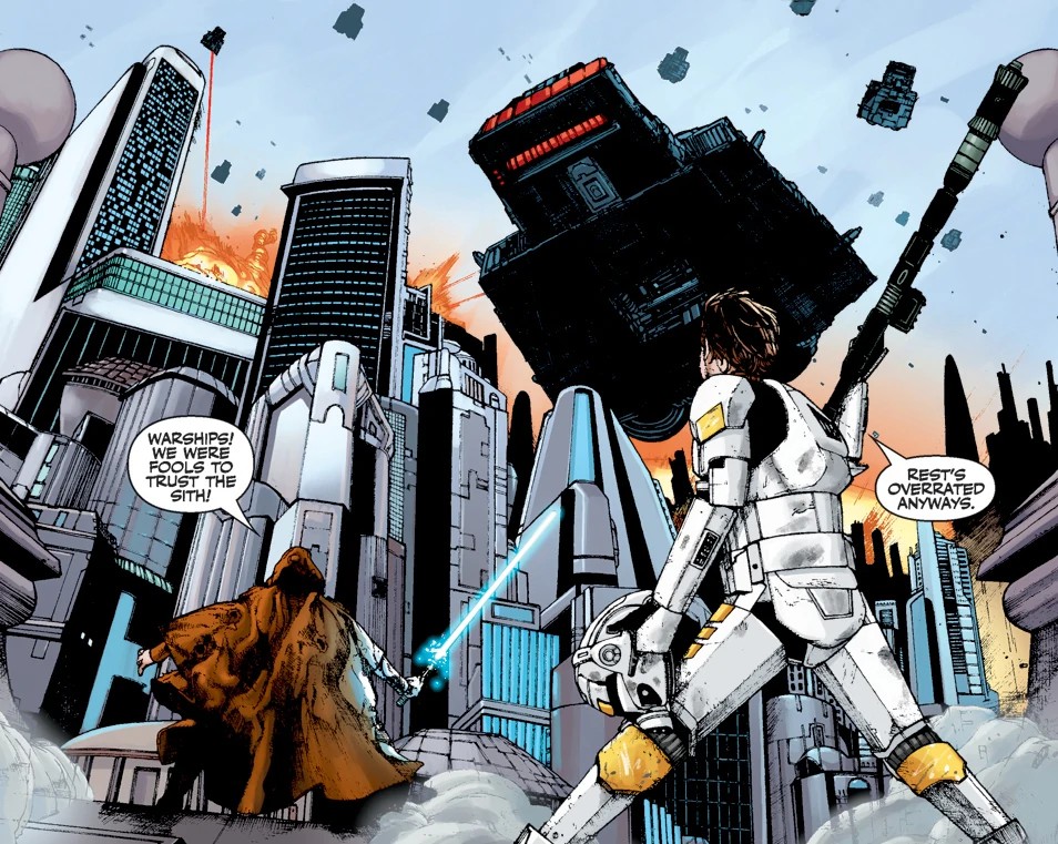 - «La Gran Guerra Galáctica se prolongó durante décadas. Miles de Jedi y Sith fueron asesinados. Innumerables sistemas estelares fueron devastados.»
