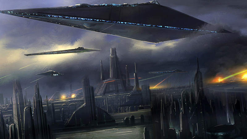 Las naves de guerra Sith descienden sobre el Distrito del Senado.