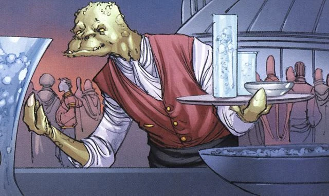 Slyssk trabajando como camarero en el Pequeño Bivoli de Goodvalor.