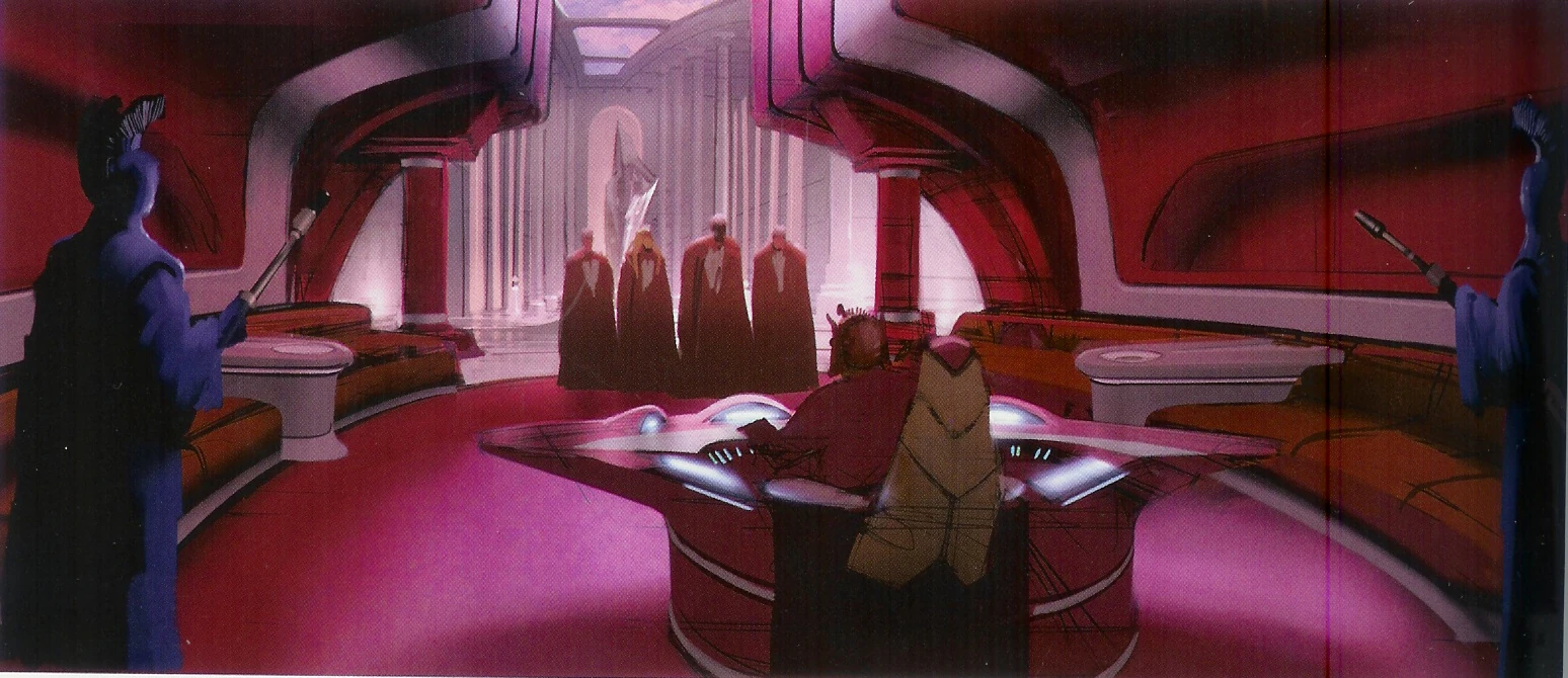 A la oficina ceremonial se accedía desde un par de puertas a prueba de blásters situadas detrás del escritorio del recepcionista. Los visitantes pasaban entonces por un corto pasillo que se abría en un gran salón circular. Frente a un set de sillas se ubicaba el despacho oficial del Canciller, equipado con información de su oficina privada y su oficina del cargo debajo de la Gran Cámara de Convocación, y detrás de él una gran ventana mostraba una vista panorámica de la Ciudad Galáctica.