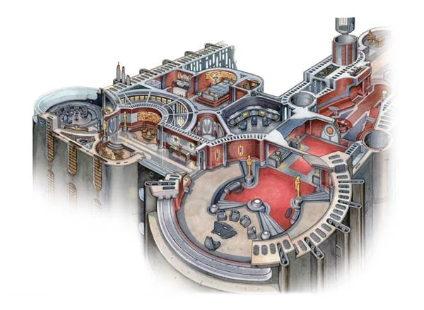 Cuando los visitantes alcanzaban el nivel donde se localizaba el Canciller, ingresaban a un área formal de recepción donde había bancos para las largas esperas. El escritorio del recepcionista estaba equipado con un sistema comunicador conectado directamente con el despacho del Canciller. Un turboascensor expreso se ubicaba adyacente al salón, y aquellos que eran lo suficientemente influyentes para usarlo eran depositados en un compartimiento de aire para ser inspeccionados, antes de pasar al área de recepción.