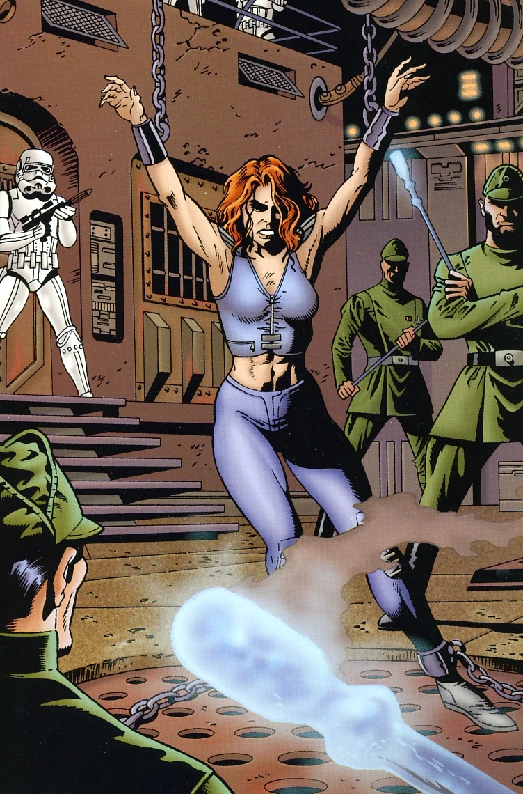 La agente de la Nueva República Mirith Sinn siendo torturado por hombres de la Guardia Imperial de Carnor Jax Imperial