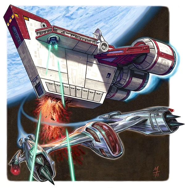 Un CR20 se defiende de un caza estelar clase Pícaro.