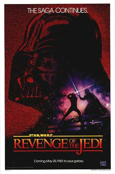Elokuvan teaser -juliste, joka julkaistiin ennen ensi-iltaa. Julisteessa esiintyy elokuvan suunniteltu nimi Revenge of the Jedi, joka vaihdettiin muotoon Return of the Jedi vain kaksi viikkoa ennen ensi-iltaa.