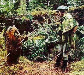 Leia tapaa ensimmäistä kertaa ewokin. Kuvassa näkyvä ewoki on nimeltään Wicket.