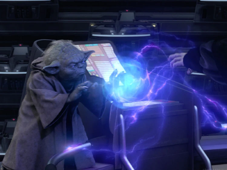 Yoda torjuu Palpatinen salamoinnin voimalla.