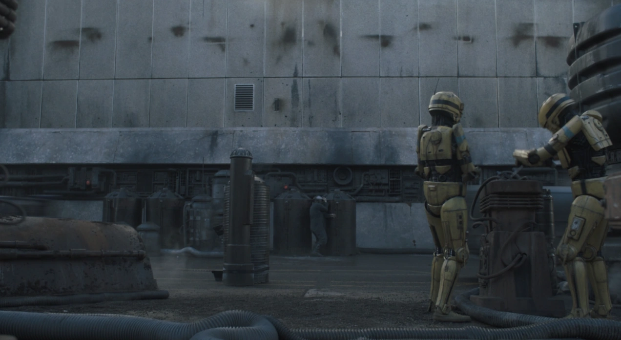Pour accéder à l'usine, il fallait passer par des postes de sécurités gardés par des soldats de la Marine Impériale et des droïdes de protocole RA-7. De plus, des Patrol troopers de la Police des autoroutes de Coronet patrouillaient à proximité de l'usine tandis que des soldats de la Marine Impériale et des officiers de l'Empire se trouvaient à l'intérieur du bâtiment et surveillaient les ouvriers.[2]