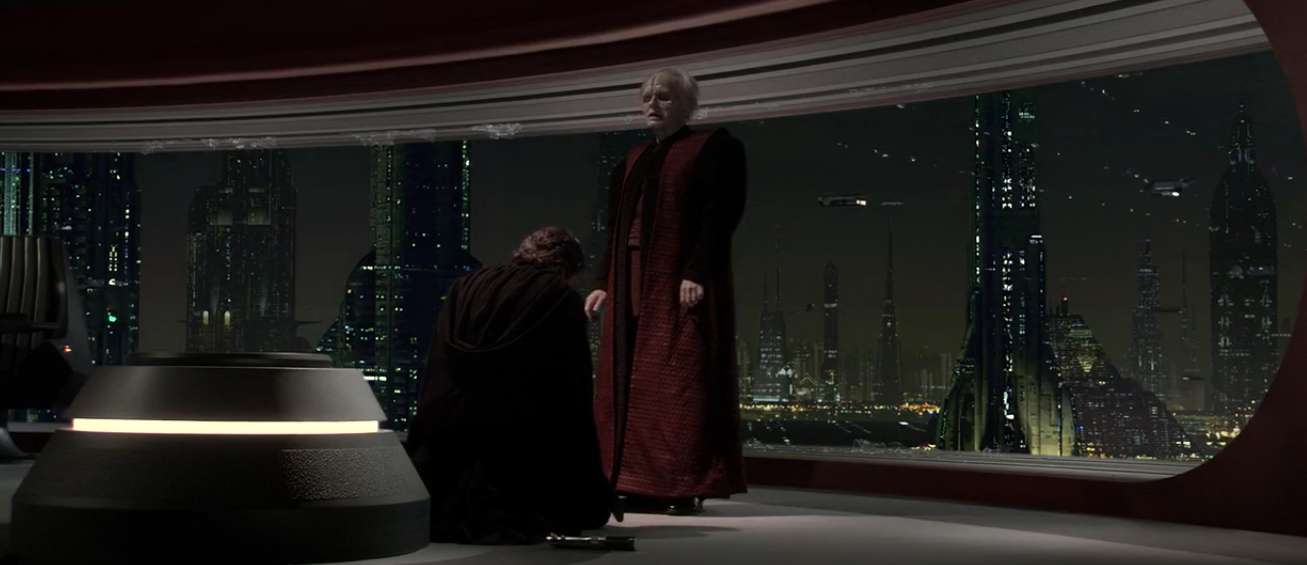 Depuis leur première rencontre, le Chancelier Suprême Palpatine, secrètement le Seigneur Noir des Sith Dark Sidious, avait remarqué le potentiel qui émanait d'Anakin Skywalker. Il se positionna dès lors pour lui comme le père qu'il n'avait jamais eu et commença à influencer ses décisions et à discréditer les Jedi à ses yeux. Skywalker croyait ardemment en Palpatine et lui confia ses plus terribles secrets comme la tuerie qu'il perpétra contre les Tuskens sur Tatooine. Vers la fin de la Guerre des Clones, Palpatine invita Anakin à l'Opéra Galactique et en profita pour lui conter l'histoire de Dark Plagueis le Sage et lui affirmer que le savoir Sith pouvait sauver des personnes de la mort comme Padmé, sa femme. Plus tard, Anakin découvrit que Palpatine était un adepte du Côté Obscur de la Force et le dénonça à Mace Windu. Ce dernier s'enquit alors, avec trois autres Jedi d'aller arrêter le Chancelier Suprême mais demanda à Anakin de rester au Temple, jugeant qu'il était trop proche du Chancelier pour intervenir.[1]