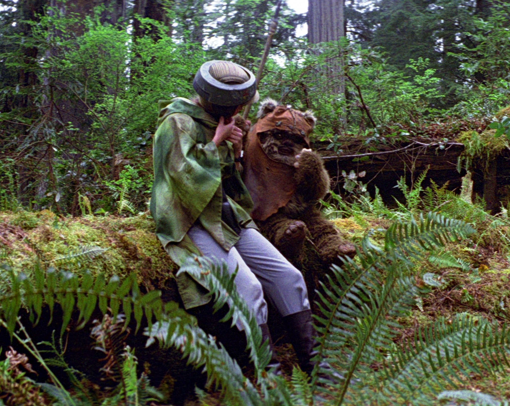 La lune d'Endor contient des surprises : des mauvaises, les motos à suspension qui permettent aux éclaireurs Impériaux d'atteindre des vitesses considérables dans les forêts de séquoias, et des bonnes, la tribu animiste des petits Ewoks, par l'intermédiaire de Wicket W. Warrick qui croise le chemin de Leia. Ils prennent le droïde doré C-3PO pour un dieu parlant leur dialecte, et sont prêts à aider le commando. Les Ewoks se joignent à la cause rebelle, l'attaque du bunker est pour demain. La nuit, dans le village des Ewoks, Luke s'éclipse du groupe, ayant réfléchi sur l'événement avec son père, qui l'a détecté sur la navette lors du contrôle orbital du mot de passe : il décide de se livrer aux forces impériales. Leia le rejoint et Luke lui demande des informations sur la véritable mère de Leia (qui est donc celle de Luke). Leia lui annonce qu'elle est morte lorsqu'elle était toute jeune et qu'elle se souvient juste qu'elle était très belle, douce mais triste.