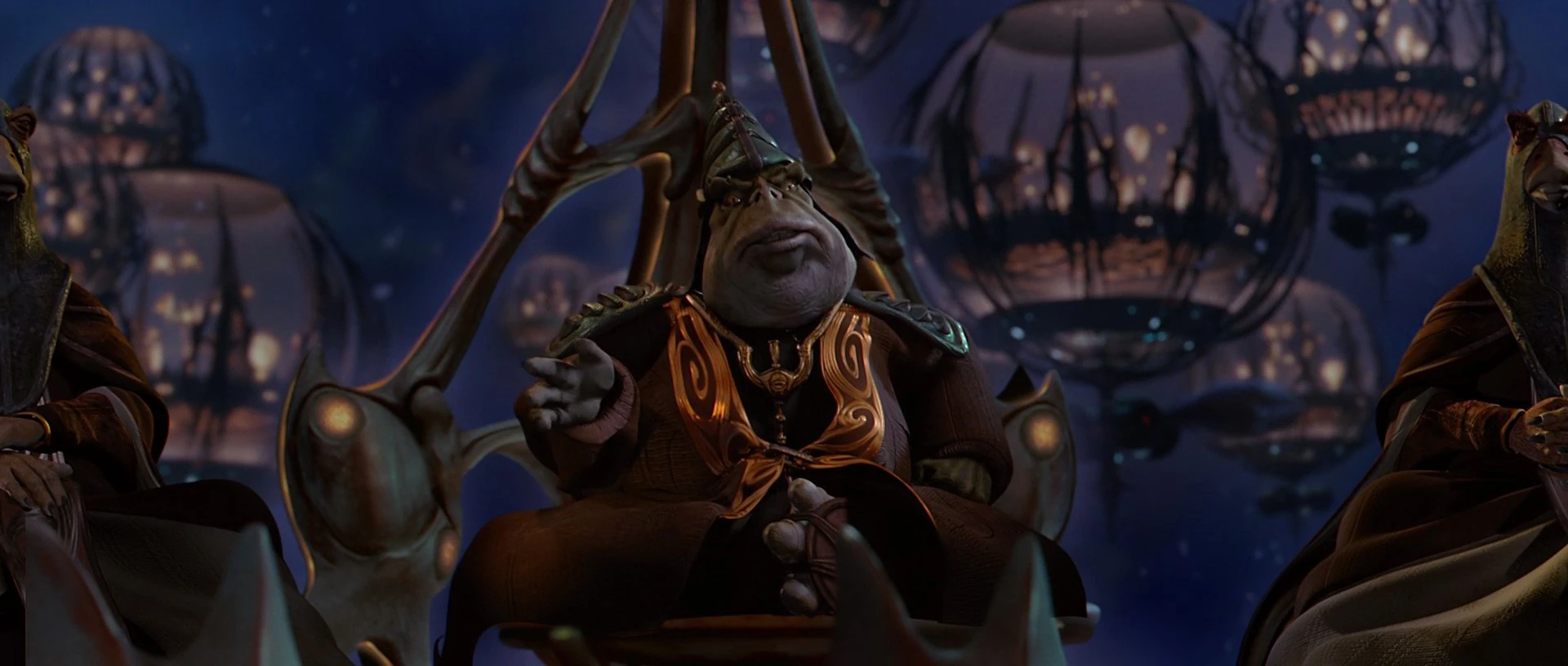 helytartóját, Nute Gunrayt. A szeparatista válság idején Jar jar Binks képviselőként szolgált a Galaktikus Szenátusban. Fontos szerepet játszott abban, hogy a Galaktikus Köztársaság megszavazta Palpatine főkancellárnak azokat a rendkívüli jogokat, amelyekkel parancsot adott egy állandó köztársasági hadsereg felállítására, válszul a szakadárok háborús tevékenységére. A gunganok harcoltak a Klónok háborújában, trónra segítve Mon Cala királyát, Lee-Chart. Ahogyan a háború tovább tombolt, a gunganok és a nabook közti ellenségeskedés ismét fellángolt, amikor szóbeszéd kapott lábra arról, hogy a gunganok a Független Rendszerek Konföderációja felé húznak. A szakadárokat pártoló Rish Loo, aki Lyonie főnök tanácsadója volt, ősi gungan misztikus erőket idézett meg, hogy rábírja a főnököt, hogy küldje a Nagy Gungan Hadsereget Theedhez, és ostromolja meg a fővárost. A tervük az volt, hogy egyesítik erőiket Grievou