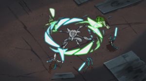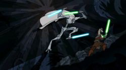 Ki-Adi-Mundi, tentò di recuperare la sua spada laser con la forza, ma Grievous la afferrò con un piede. In risposta, Ki-Adi telecineticamente chiamò a se una delle spade attaccate alla cintura di Grievous. Il cyborg, non essendo sensibile alla forza e aventi tutte le sue membra occupati, non è stato in grado di prevenirlo. Quando Mundi alzò l'arma, il Jedi e il cyborg, si guardarono negli ochhi. Grievous, saltò improvvisamente verso Mundi, e, forte delle sue tre spade laser disarmò lo Jedi.