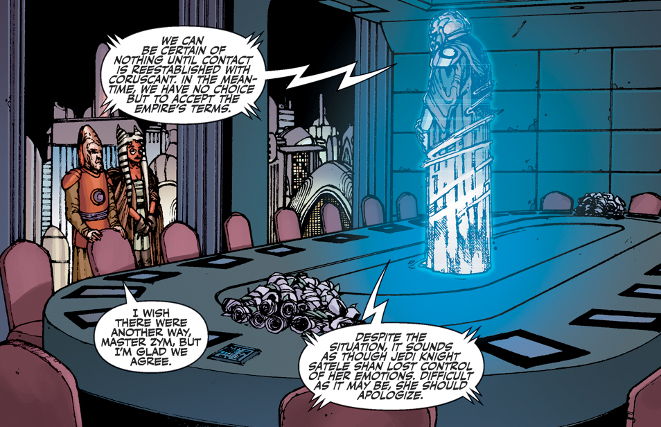 Shan attaccò Baras in risposta all'attacco a Coruscant. Il Signore dei Sith spiegò che la capitale repubblicana era tenuta in ostaggio e le negoziazioni su Alderaan sarebbero andate come l'Impero desiderava, senza che i Jedi si potessero intromettere. Dar'Nala dichiarò che la delegazione della Repubblica non avrebbe mai accettato le richieste dell'Impero, ma fu richiamata alla calma dal Senatore Am-Ris. Dar'Nala richiamò Shan e la delegazione si ritirò a discutere degli eventi. Erano impossibilitati a stabilire un contatto con qualunque autorità su Coruscant; Dar'Nala e Am-Ris durante la notte organizzarono un incontro con il Gran Mestro Zym via ologramma. Zym era lontano dalla capitale al momento dell'assalto, d'accordo con il senatore Am-Ris che senza alcuna notizia da Coruscant non potevano essere certi del danno che i Sith avevano inflitto sulla capitale. Fu deciso che la delegazione avrebbe accettato le richieste dell'Impero Sith e il Maestro Dar'Nala avrebbe chiesto scusa a Lord Baras per il comportamento di Satele Shan e il violento attacco del giorno precedente.