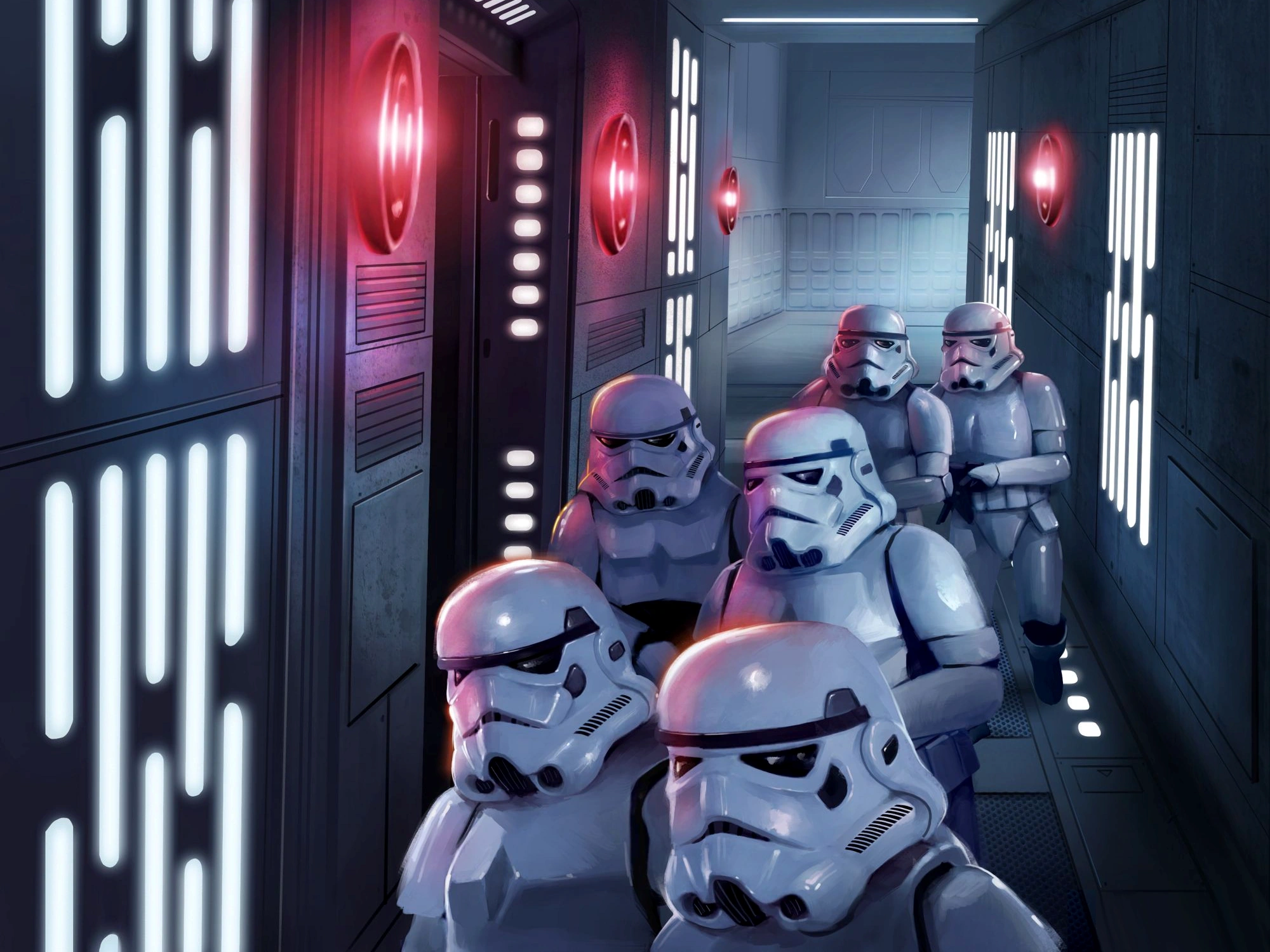 クラクションが鳴り響く中、通路を移動するストームトルーパー