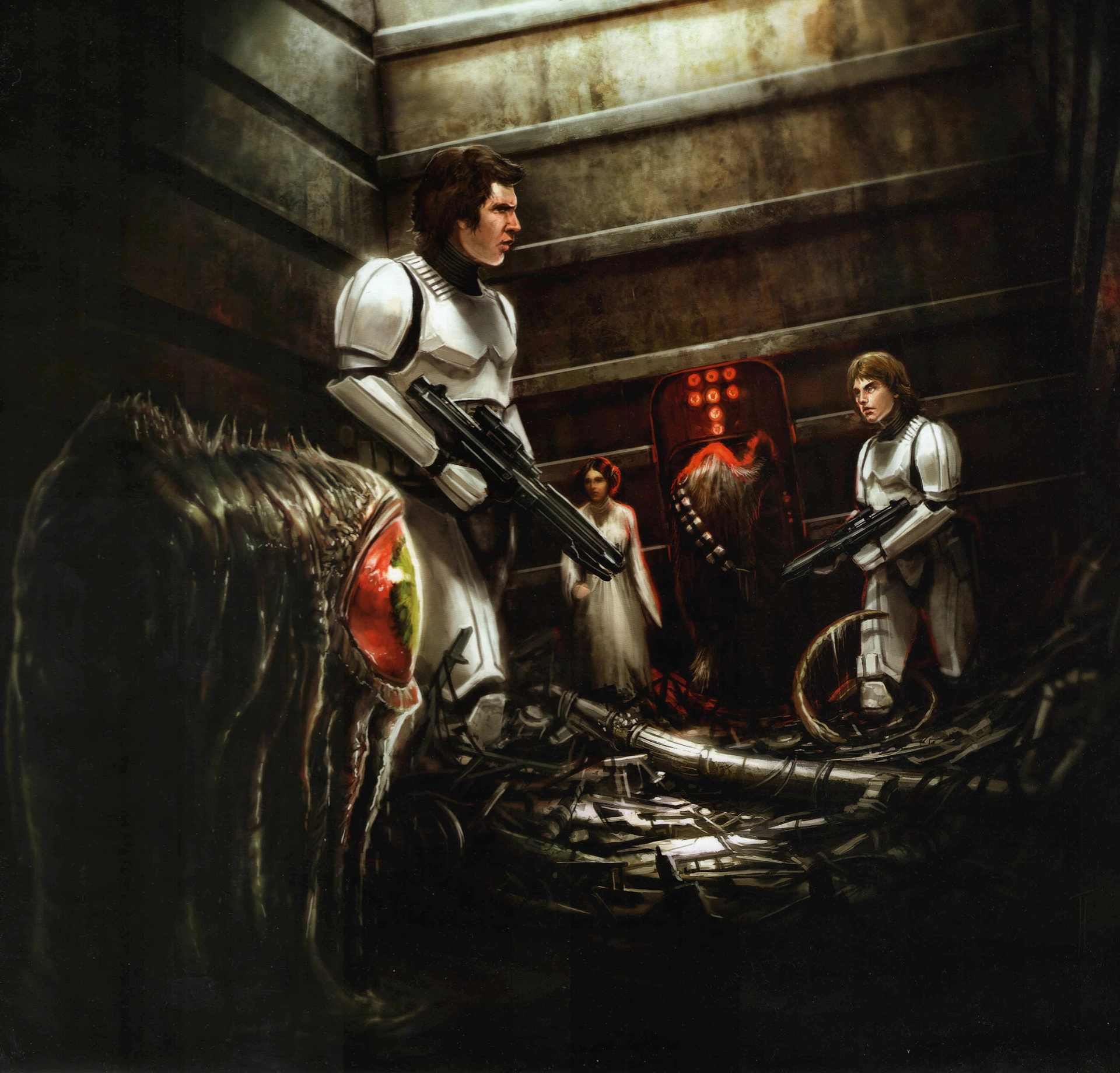 ゴミ圧縮機に閉じ込められたルーク、ハン、レイア、チューバッカ
