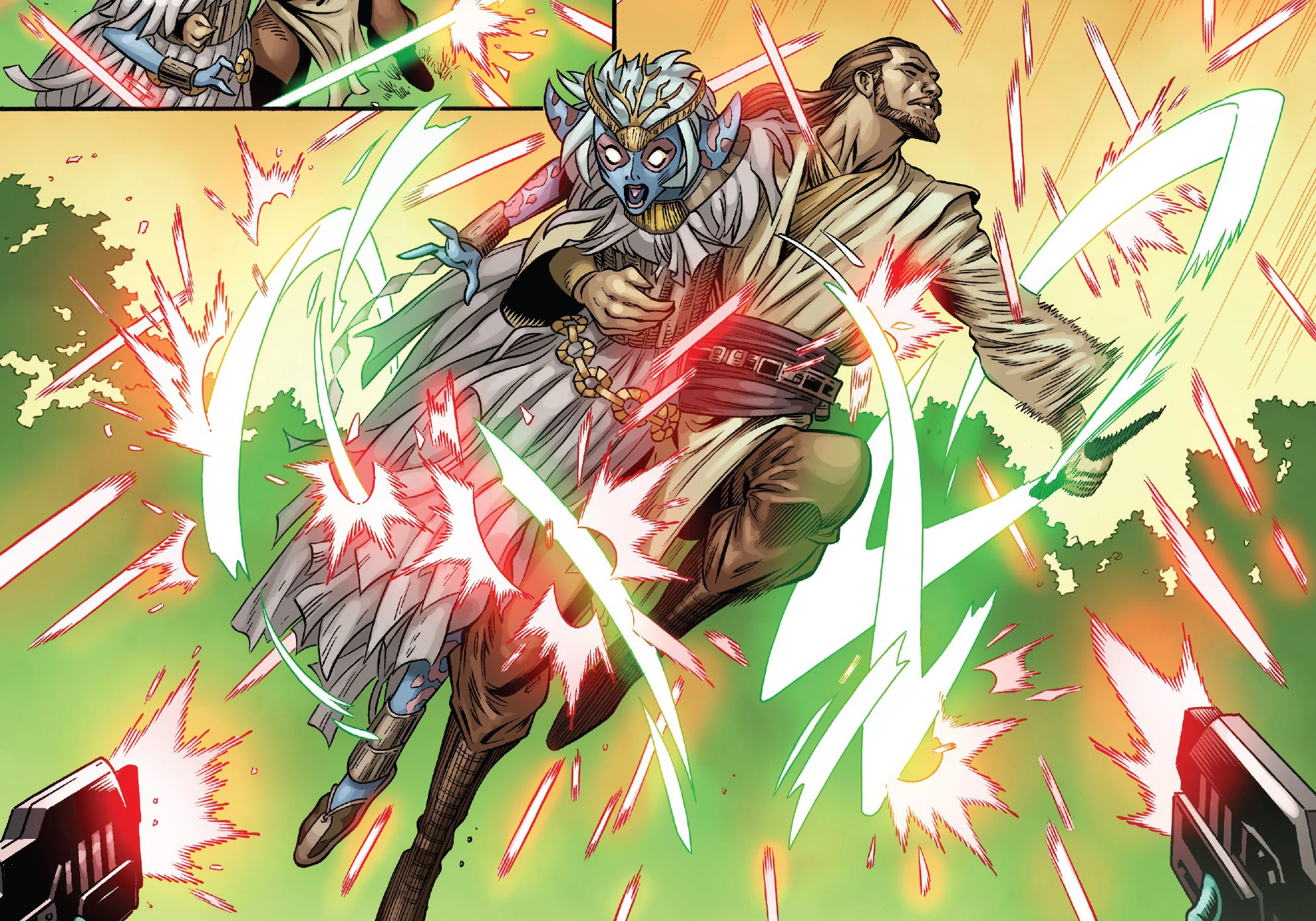 間もなくスィアとジェダイ・マスターは森のなかでメタル・クランに取り囲まれてしまう。メタル・クランの長は、女司祭の言葉か血を手に入れさえすれば、木々を滅ぼすことができると豪語した。ジェダイが自分のために戦ってくれると信じているスィアは、メタル・クランの長に対して力強く抗議したが、クワイ=ガンが突然彼女の体を掴んだため、その言葉は遮られた。現時点で平和的解決は望めないと判断したクワイ=ガンは、スィアを連れてこの場から逃げ出すことに決めていた。敵のリーダーが攻撃を命じた瞬間、クワイ=ガンは脱出に反対するスィアを抱えて上空のシャトルに向かって跳躍した。クワイ=ガンはライトセーバーを使ってメタル・クランのブラスター・ビームを偏向し、無事にシャトルのタラップに乗り移った。クワイ=ガンがこのままコルサントに戻るつもりであると知ると、女司祭は木々を見捨てることはできないと主張した。しかしクワイ=ガンは彼女の言葉か血を手に入れないかぎり、敵は木々を傷つけることはできないと指摘し、今は安全な場所へ連れて行くことが先決だと告げた。[1]